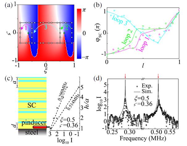外尔(Weyl)半金属是一种三维固体材料,具有许多独特的特性,如手性异常和拓扑费米弧表面态等。近期,人们已经将外尔物理研究推广到三维声子晶体中。本文利用简单的一维声子晶体外加两个额外的结构参数,构造、合成了虚拟的三维空间以及外尔点(图1),探索外尔材料中的物理现象。基于精确的超声实验,作者们不仅第一次直接观察到了合成空间中的外尔点(图2),还验证了与合成外尔点拓扑稳定性相关的反射相位奇异性(图3),进而检测了该合成体系中的拓扑非平庸界面态及其传输特性。