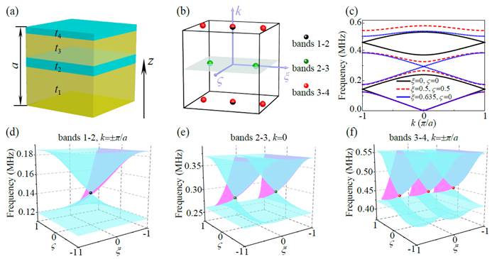 图1:利用一维声子晶体和两个额外的几何参数构建虚拟的三维空间,实现合成的外尔点。
