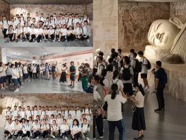 下午的活动首先来到了一中师生一直期待的万林博物馆“万里千年——敦煌石窟考古特展”。在参观游学之前,一中老师给同学们布置了敦煌历史的相关课题作业,每个同学都是带着疑问和自己的思考来参观的。进入博物馆,映入眼帘的大卧佛造像引得同学们称赞不已,纷纷拍照留念。在现场讲解志愿者刘奕江同学的带领下,同学们一边认真听着讲解,一边找机会提出自己的问题,现场互动良好,讲学相互促进,同学们收获满满。万林博物馆的展览再一次让师生感受到成人直播