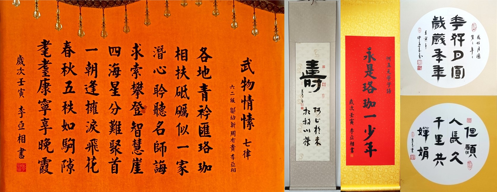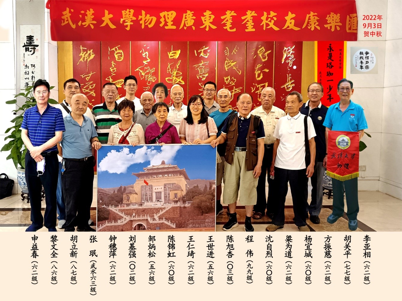 物理广东耄耋校友康乐汇》聚会活动。这道信息一发出,居深圳的62级申益春就构思写下了大幅“寿—何止于米 相期以茶”和“但愿人长久 千里共婵娟”庆中秋的作品供会场展示。62级邹幼新(山东东营)、周有贵(海南)、李亚相(广州)以纪念进校60周年并献给广东耄耋校友康乐汇为题,合同作诗《七律 武物情愫》“各地青衿汇珞咖 相扶砥砺似一家 潜心聆听名师诲 求索攀登智慧崖 四海星分难聚首 一朝逢拥泪飞花 春秋五秩如驹隙 耄耋康宁享晚霞”,李亚相还将诗词书写在大幅纸张上供会场展示;李亚相还特制了一幅1米×1.33米武大行政大楼的摄像安放在会场显著位置,以使会场有“回珈(家)”的感觉。李亚相把《珞珈赋》作者何五元的“永是珞珈一少年”名句书写成了大幅字轴供会场展示。62级钟穗萍专心作了《九鱼跃莲池》和《雄风万里》两幅大画作供会场展示。李亚相还把应“粤二·九”联谊会秘书长杨宜城请求书写的《两弹一星精神》《载人航天精神》《科学家精神》三幅大书画供会场展示。