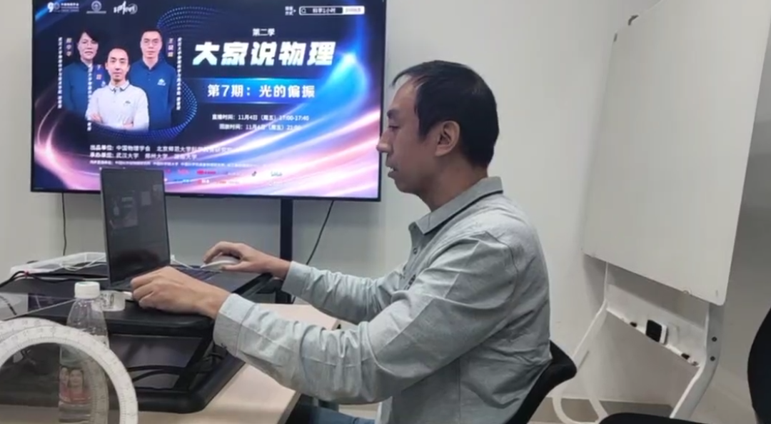 “科学一小时”的“大家说物理”系列课程由国内顶尖高校和科研机构的科学家讲授中学生听得懂的物理科学前沿,帮助青少年拓展视野、激发兴趣、保持好奇心和求知欲,发现具有未来科学家潜质的青少年。11月4日的节目为第二季第7期的直播内容,三位老师从显色偏振的演示实验开始,展示了神奇的与偏振有关的物理现象,讲述了历史上发现方解石双折射现象和光的偏振现象的小故事,讲授了什么是光的偏振——如何产生偏振——如何改变偏振状态——如何利用偏振等科普知识,寓教于乐,通俗易懂。三位老师还给观众布置了课外作业——利用偏光太阳镜、万花筒、透明胶带制作偏光万花筒,利用透明胶带在亚克力板上制作显色偏振艺术作品。为激发青少年好奇心,三位老师在每一部分都精心设计了生动有趣的演示实验,其中包括:显色偏振、方解石的双像、用信号源和示波器展示两个相互垂直信号的合成、反射光和散射光的部分偏振性、方解石出射光线的偏振性、IMAX 3D眼镜原理演示、RealD 3D眼镜原理演示、光弹效应演示。科普视频的播出取得了较好的效果,单个平台点击量超过4.9万。