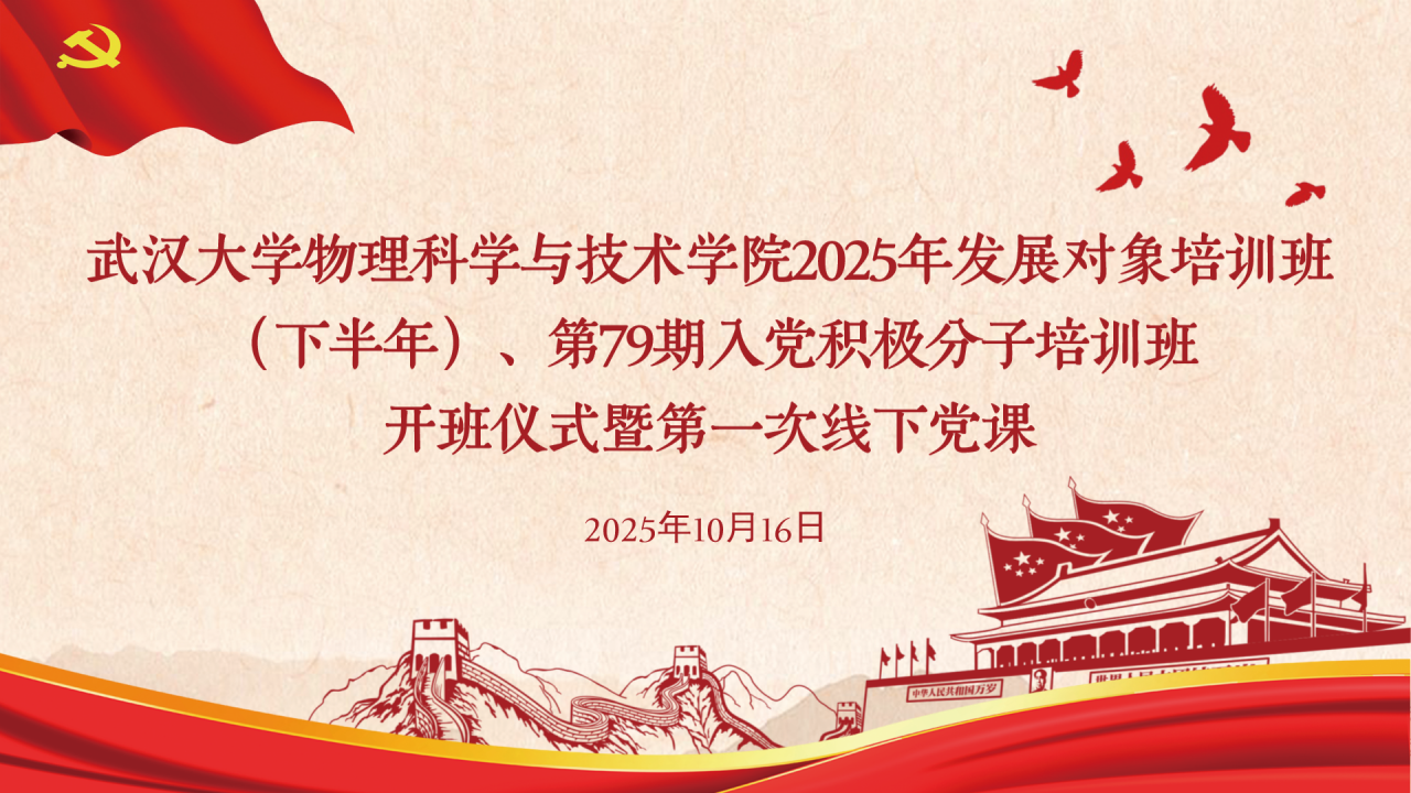 为深入学习贯彻习近平新时代中国特色社会主义思想和党的二十大精神,贯彻落实新时代党的建设总要求和新时代党的组织路线,严格党员发展程序,提升党员综合素质。2025年10月16日下午14:30,武汉大学物理科学与技术学院在学院D503报告厅举办了武汉大学物理科学与技术学院2025年发展对象培训班(下半年)、第79期入党积极分子培训班开班仪式暨第一堂线下党课活动,学院党委副书记陈阳老师、学院青年讲师团杨奕教授、学院党委专职组织员朱娟蓉老师、学生工作办公室副主任刘文娣老师出席仪式。培训班班主任、本科生辅导员彭瑾老师主持本次开班仪式。