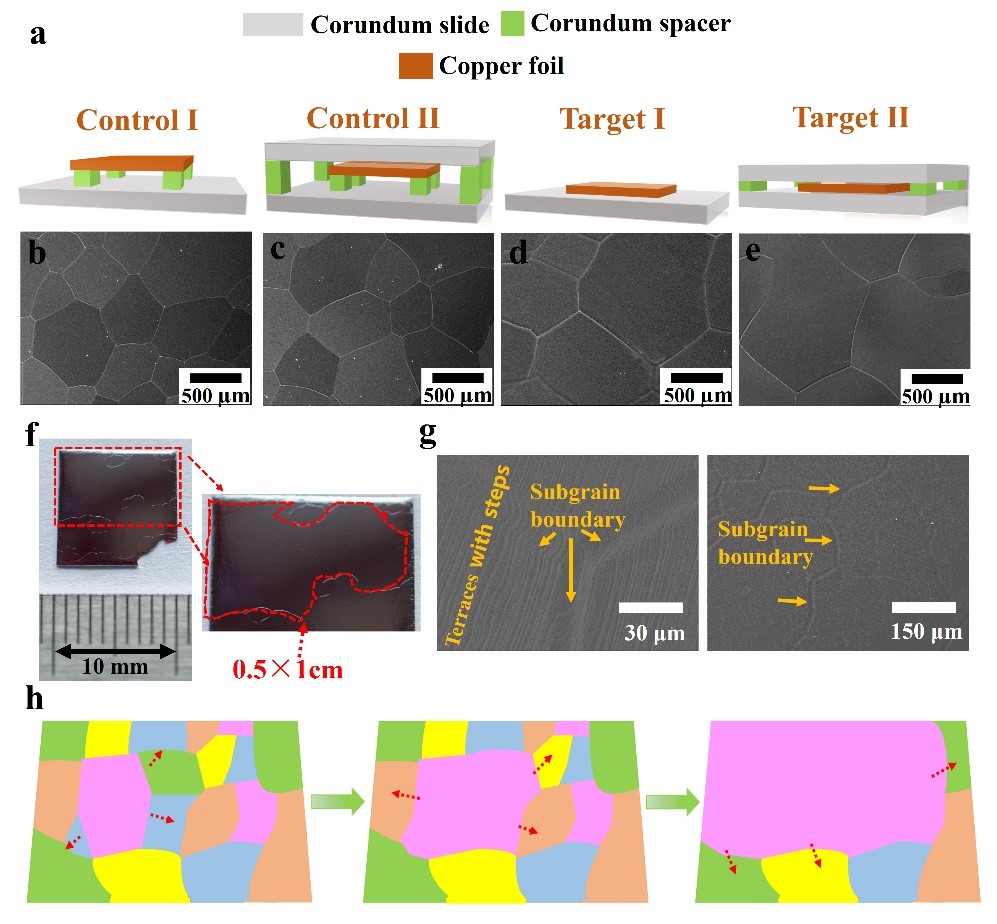 在高结晶质量晶体生长中,往往需要避免晶格失配产生的应力。在这项工作中,研究人员另辟蹊跷,研究了一种新的双面应力辅助热氧化(BSATO)方法来制备高度取向的厘米级晶粒准单晶Cu2O (c-Cu2O),其材料与器件的主要性能参数为空穴迁移率超过100 cm2V-1s-1、少子寿命达92.8 µs、摇摆曲线半高宽0.022度、开路电压0.95 V,自驱动探测器响应度0.309 A/W。 并提出了应变能驱动的晶体生长机制。