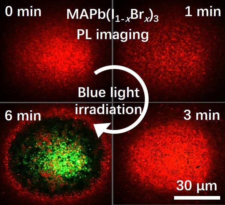 该工作通过原位观测混合卤素钙钛矿的荧光变化,系统的研究了该类材料在光照下的稳定性问题,对后续器件的优化具有重要的指导意义。该研究得到了科技部、国家自然科学基金委等基金资助。
