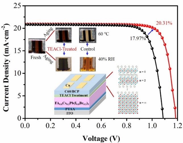 这项工作研究了倒置结构1.68 eV宽带隙钙钛矿太阳能电池的界面调控,即采用噻吩乙胺盐酸盐(TEACl)形成2D/3D钙钛矿异质结界面,得到高效稳定的宽带隙钙钛矿太阳能电池。噻吩和氨基官能团能钝化钙钛矿薄膜中带正电和负电的电荷缺陷,同时在Br/I混合钙钛矿中Cl的加入能进一步地稳定宽带隙钙钛矿物相。因此2D钙钛矿界面的形成钝化了钙钛矿薄膜表面与晶界处的缺陷,增加了离子迁移的活化能,最终宽带隙钙钛矿太阳能电池的暗态饱和电流密度减少,VOC损失降低,最终实现了20.31%的冠军效率。更重要的是,TEACl处理的器件在苛刻的条件下(如潮湿的空气环境、加热)相对于对照组器件表现出更好的稳定性。另外,构筑的四端(4-T)钙钛矿/铜铟镓硒叠层太阳能电池取得了24.0%的效率。