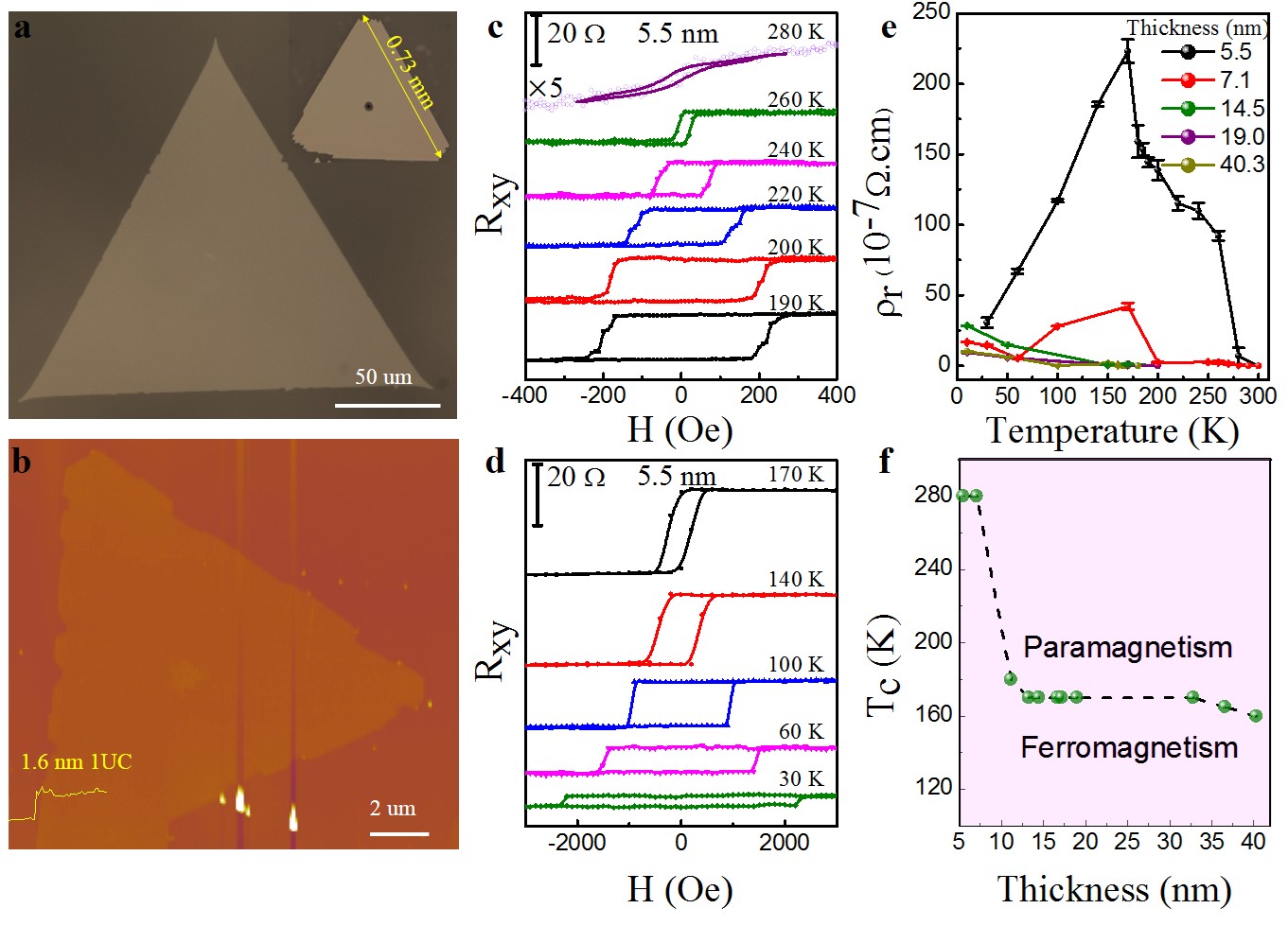 二维(2D)材料,尺寸降低至原子级厚度时出现新奇的物理现象,如Ising超导,拓扑半金属中的量子自旋霍尔效应(QSHE),强的室温铁电性等等. 2D铁磁体作为2D材料家族的重要组成部分,因其独特的物理特性而备受关注。基于Mermin-Wagner定理,热波动将破坏2D各向同性海森堡模型中的长程铁磁有序。但最近的报告揭示了二维绝缘Cr2Ge2Te6, CrI3和金属Fe3GeTe2,VSe2的长程铁磁有序,引发了二维铁磁材料研究热潮。在范德华外延法可控制备的研究基础上,何军课题组进一步实现了1到2个晶胞厚度Cr2Te3单晶的大面积制备。2D铁磁体的居里温度(Tc)受层间磁耦合所支配,随厚度降低Tc降低,并且远低于室温。 然而室温铁磁对于自旋电子器件、磁存储等的实际应用十分重要。该研究发现通过调制2D Cr2Te3的厚度可以实现室温铁磁性。Cr2Te3 的Tc从块体材料中的160 K通过调制材料厚度到5-6个晶胞厚度时,其Tc会急剧提升至280 K。磁化强度和反常霍尔效应(AHE)测量为室温下自发磁化的存在提供了明确的证据。理论模型表明,Cr2Te3的表面重构可能是导致Tc反常厚度依赖性的起源。这种尺寸调制方法为操纵铁磁性开辟了一条新途径。