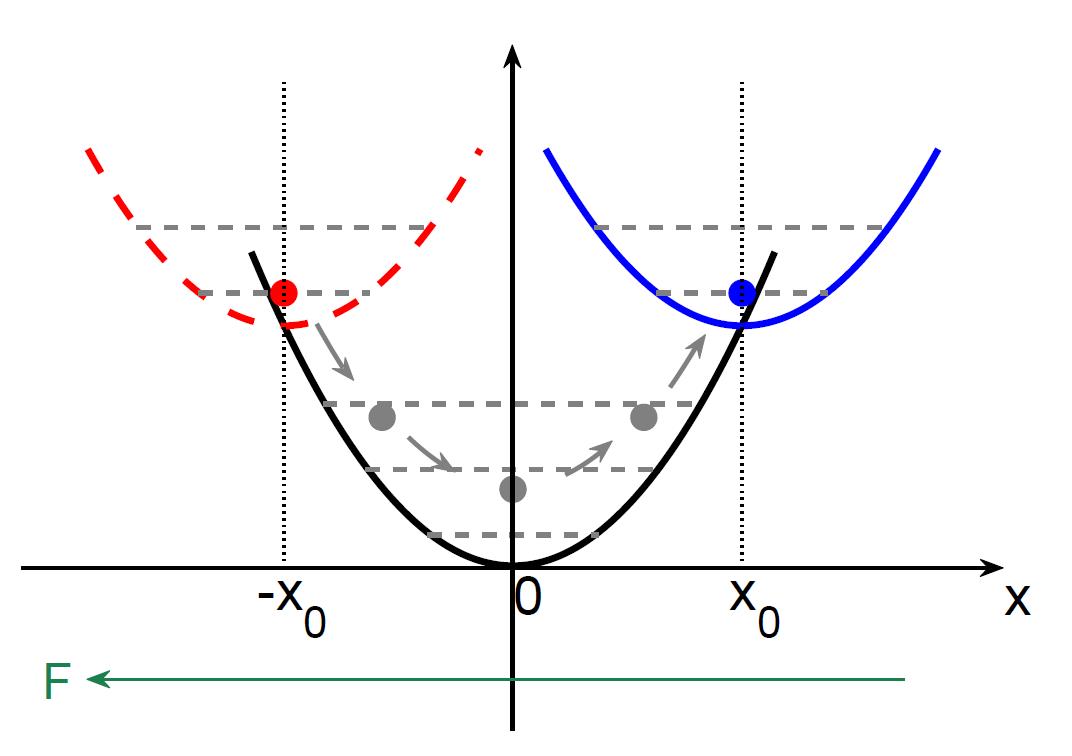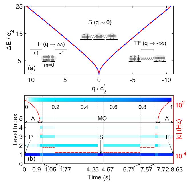 上左图在谐振子体系中展示了多能级振荡方法的物理原理:为了将谐振子从红色位置快速转移到蓝色(基态)位置,将外力F突然撤掉,红色小球会在黑色势阱中振荡;经过半个周期,突然将F反向加上即可。上右图表明在自旋1的玻色-爱因斯坦凝聚体中,利用多步多能级振荡过程,快速高效地制备1000个原子的纠缠单重态和孪生双数态。