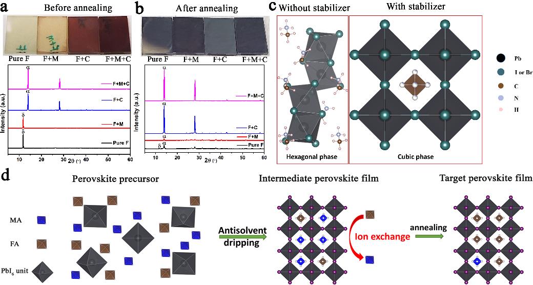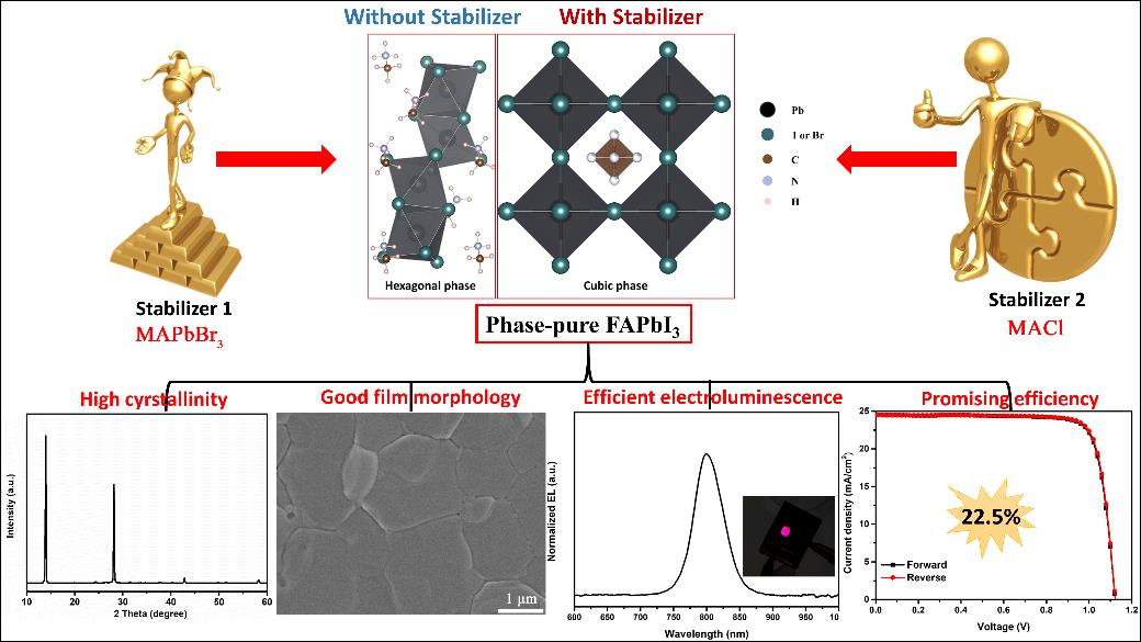 近期,成人直播 方国家教授课题组和香港理工大学李刚教授课题组合作,开发了一种稳定剂辅助生长高质量钙钛矿薄膜的方法,并显著提高了相应钙钛矿电池的光电性能和稳定性。甲脒铅碘(FAPbI3)基钙钛矿具有理想的光学带隙,根据Shockley-Queisser效率极限,FAPbI3钙钛矿太阳能电池具有更高的理论光电转换效率。但FAPbI3材料的相稳定性和长期稳定性都比较差,因此很难制备高效、稳定的FAPbI3基钙钛矿电池。