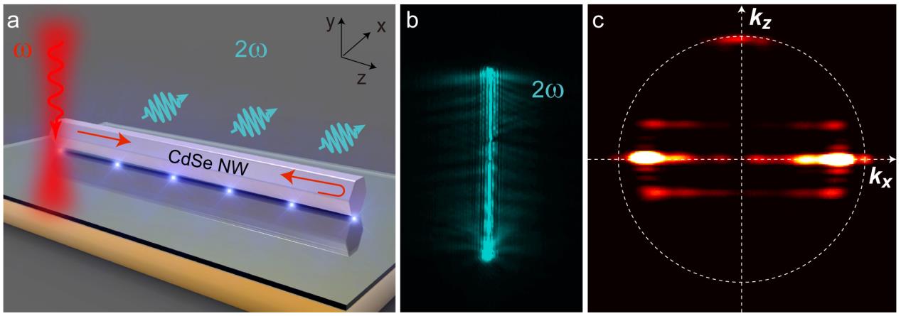 基于二次谐波(SHG)产生的片上波长转换器将是开发高效的纳米级相干光源的途径之一,在小型化集成光子回路、生物成像和传感等技术有重要应用前景。然而对于一般的微纳米结构,SHG的光转换效率很低。徐红星教授课题组提出了一种由半导体(CdSe)纳米线与金膜耦合而成的混合等离激元波导来实现高效SHG的方案[图1(a)]。该波导中的模式与非线性材料(CdSe)之间有着较强的空间重叠,且波导中多个模式相互耦合,沿着波导方向满足动量守恒,这些因素促进了高效率的SHG产生。实验中产生高达4×10-5W-1转换效率的二次谐波产生,比已有报道的纯等离激元结构高出几个数量级。另外,该工作利用前期工作[Nano Lett. 17, 7803 (2017)]发展起来的SHG傅里叶成像技术,准确辨认了二次谐波过程中具体参与的模式,揭示了模式对称性对SHG发射方向的影响[图1(c)]。该研究结果有助于实现高效和可调谐的非线性相干光源,为开展集成非线性纳米光子器件提供了新的方案。