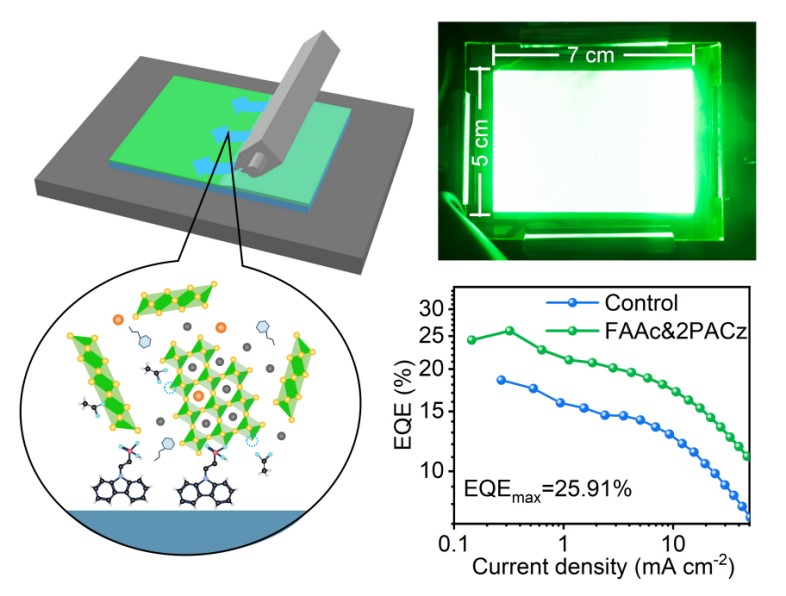 在该项研究中,研究人员搭建了一套原位表征测试系统来监测钙钛矿的成核、结晶过程。通过在钙钛矿前驱体溶液中加入醋酸甲脒(FAAC),提高了钙钛矿的成核速率和晶核密度,提升了钙钛矿的成核均匀性。此外,在聚(9-乙烯基咔唑)(PVK)空穴传输层上方插入了一层[2-(9h -咔唑-9-酰基)乙基]膦酸(2PACz)。它可以锚定在前驱体溶液中形成的钙钛矿纳米晶核,增加溶质的空间位阻,从而减缓结晶速率,提高结晶质量。在此基础上,得到了均匀性显著改善、光致发光量子产率显著提高的大面积钙钛矿纳米多晶薄膜。并制备了最大外量子效率为25.91%的(2 × 2 mm2)小面积PeLED,这是目前刮涂法制备PeLED的最高记录。还制备了(5 × 7 cm2)的大面积PeLED,是目前报道的溶液法制备的最大面积的PeLED。