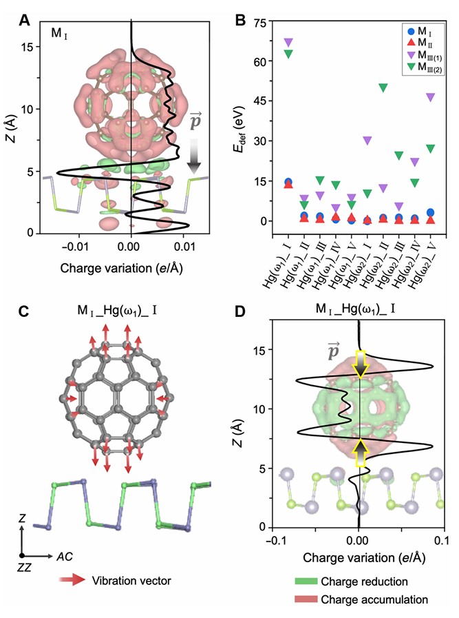实验技术上的改进使得新的物理现象得以被发现。实验研究发现,Hg(ω1)振子激发效率远高于其他模式,不受通常决定振子激发耦合常数的分子吸附结构、电子结构等物理因素的影响。这挑战了传统的实验结果和理论模型。研究结果表明分子-基地界面处瞬时存在由电荷转移导致的界面偶极,显著增强了Hg(ω1)的电子-振动激发(如下图)。尽管界面非常普遍,但界面电荷转移偶极振子激发在前期实验和理论研究中都没有被考虑过。该发现揭示了一种通过设计分子-半导体界面来控制分子电子传输的方法,为更高效的分子电子器件、能源系统和传感技术的开发开辟了可能的新途径。