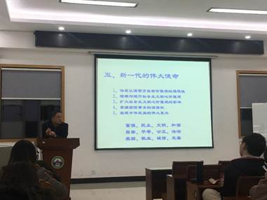 紧接着,乔教授带领大家回顾近代历史。从辛亥革命到无产阶级革命,从新中国成立到改革开放,中华民族经历了从站起来,富起来到强起来的伟大飞跃。在这个过程中,每一代人都在努力肩负着自己的使命。目前,中国成为世界大国,但是,我们青年一辈还需要继续努力,坚持走中国特色社会主义道路,参与到中华民族伟大复兴中国梦的实现进程中。