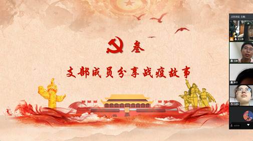 紧接着支部成员分享战疫故事。李娟与大家分享了四川省第四人民医院内科四病区护士佘沙的故事。佘沙请战时的一番话,让广大网友为这位90后护士动容。汶川地震发生时,佘沙在汶川漩口的家遭受了重创。当时还是一名学生的佘沙,看着家园在全国人民的帮助支援下,迅速地重建了起来,给年少的她留下了难以忘却的记忆。感恩之心——这也成为疫情发生后,她多次主动请战的动力源泉。王圆、陈贝、孙悦、陈柯坷分享了他们当地社区基层工作者的故事,所有参与疫情防控的社区工作者们,放弃了安全的居家防疫,纷纷投入到社区的整体防疫工作之中。很多社区工作人员也都顾不上家中年迈的老人、年幼的孩子,所有的时间几乎都在防疫岗位上加班加点,用自己的实际行动,舍身忘我的投身到本次冠状肺炎阻击战中。