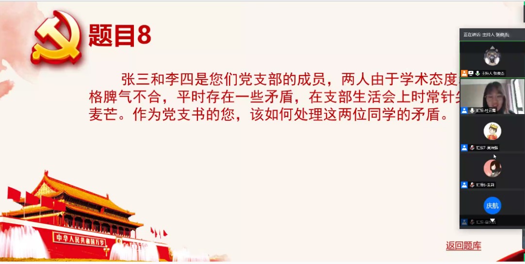 第一阶段的比拼结束之后,物理二支部和微电二支部顺利晋级,进入第二阶段,案例分析。微电二支部抽到的题目是关于如何解决支部成员矛盾的问题。微电二支部书记杜云霄沉着冷静,分别从指导老师谈心谈话,支部支委分工协作,支部活动正向引导三个方面有条不紊地回答问题。物理二支部抽到的题目是关于党支部如何应对网络上疫情谣言的问题,物理二支部书记唐庆航结合了自己支部的抗疫知识竞赛活动,完美地将答案赋予支部特色。两位书记出色的完成了第二阶段的挑战,取得了优异成绩。