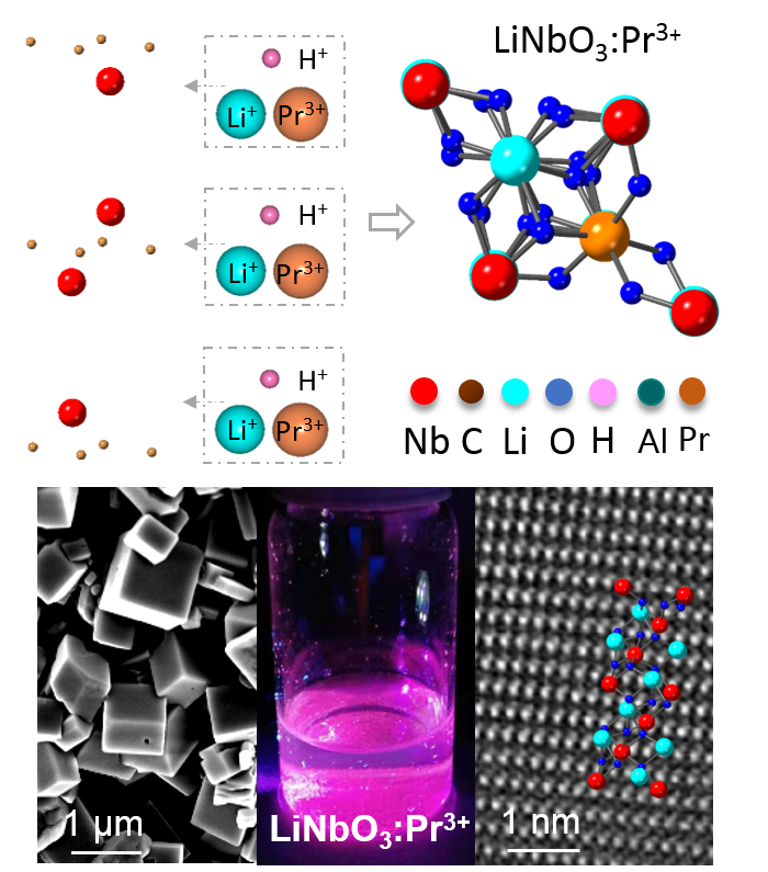 LiNbO3具有出色的铁电性,超高的居里温度,优异的光折变和光伏性能,以及较大的电光和声光系数等特性,在非易失性全息存储,声学镊子,波导等领域具有重要应用价值。此外,稀土元素掺杂的LiNbO3:RE3+晶体在应力发光,和上下转换发光等领域有重要应用前景。目前,合成的LiNbO3以粉末、纳米颗粒和薄膜等形貌为主,稀土掺杂的LiNbO3粉体也主要通过高温烧结合成,以MXene为前驱体通过水热法合成的大尺寸片状LiNbO3铁电晶体和LiNbO3:Pr3+铁电光致发光晶体尚未报道。本研究报道了以Nb2CMXene为前驱体,通过表面活性剂调节晶体生长,合成片状LiNbO3晶体和稀土元素掺杂LiNbO3:Pr3+光致发光晶体的全新路径(图2),通过生长光致发光铁电LiNbO3晶体进一步证明了MXene的材料广泛应用前景。这项工作不仅为合成取向良好的上下转换发光晶体提供了一种崭新的方式表明,同时也为拓展MXenes材料的多元化应用,提供了新的思路。