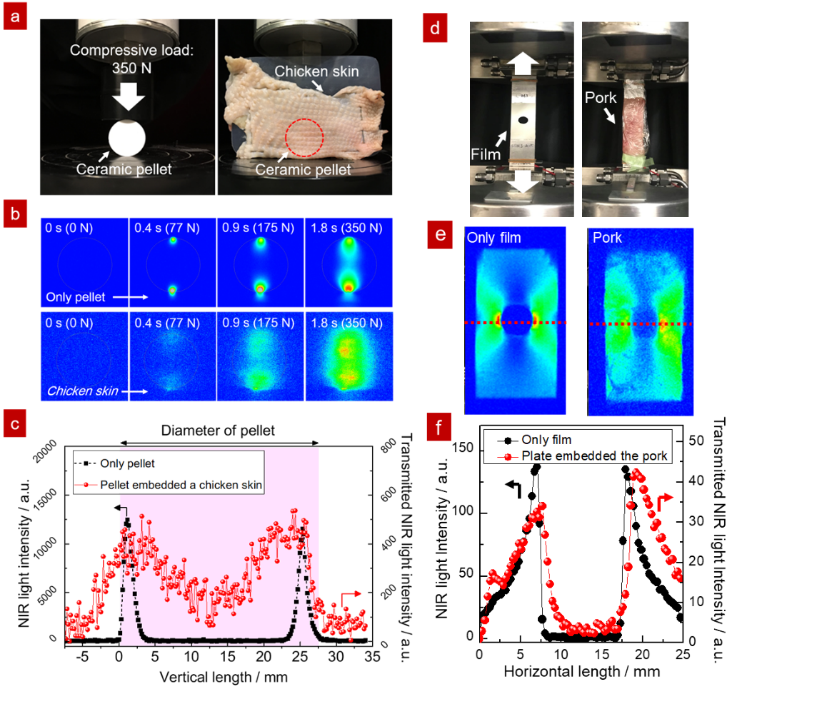 涂东研究员在其研究中成功开发了具有可持续性和超敏度的近红外应力发光材料Sr3Sn2O7:Nd3+,此材料仅仅利用微应力应变即可实现800-1500nm的近红外应力发光效果,而其铁电特性也有效地提升了应力发光强度,即使在白光照明的条件下,此材料也能够实现微应变级别(低于1000µst)的应力传感。除此之外,本研究还利用Sr3Sn2O7:Nd3+的近红外应力发光效果成功进行了生物组织遮挡下的高对比度成像和生物力学应力传感,其发光强度分布与应力模拟计算的结果展现出很好的一致性(图1。这项研究展现出近红外应力发光材料在生物力学性能分析方面具有重大的应用潜力,通过生物体外的发光图像的采集和分析,即可以获得生物体内力学性能的有效信息,尤其对诸如小动物髋关节和植入性骨板等在生物体内的应力分析和缺陷检测等应用起到重要推动作用。