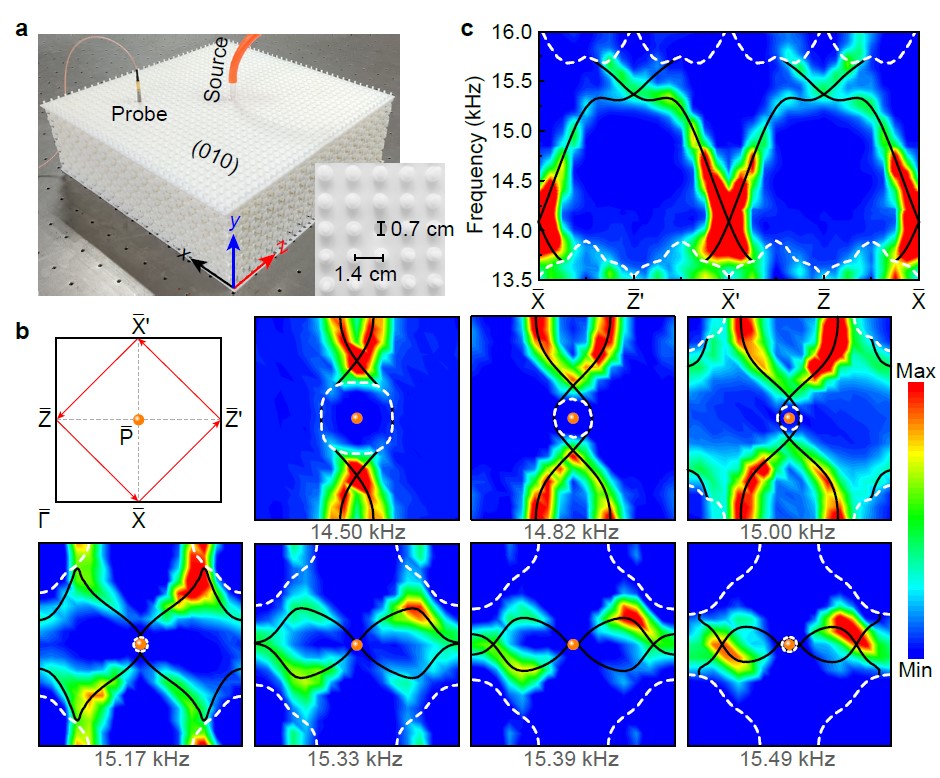 发现新的拓扑物态已成为基础物理学和材料科学的一个重要目标。作为最具代表性的拓扑物态之一,三维狄拉克半金属(DSM)是探索拓扑相变和其他新颖拓扑量子态的绝佳平台。它可以容纳许多奇特的传输特性,如反常磁阻和超高迁移率。目前,研究者们发现DSM相可偶然出现于正常绝缘体和拓扑绝缘体的转变处。要达到这样的临界点,需要对材料的化学组分进行微调,这一点在实验上很难实现。三维DSM也可以在不微调材料组分的情况下出现,主要分为两大类。第一类是基于能带反转机制,已在Na3Bi Cd3As2中实现。在这类体系中,狄拉克点始终成对出现在动量空间的旋转轴上;在维持晶体对称性不变的情况下,可以通过连续调节参数将它们成对湮灭。第二类DSM中的狄拉克点稳定地钉扎在布里渊区的离散高对称点上。显著区别于第一类体系,这类狄拉克点受非点式空间群保证,在维持晶体对称性的情形下无法消除。尽管人们已经提出一些固态候选材料,由于材料合成的巨大挑战,这类对称性保证的狄拉克晶体尚未实验实现。最近,人们利用经典波体系(如声子晶体)实现了许多不同的拓扑物态;这类结构参数可控的宏观体系也为探索全新的拓扑物理提供了机遇。