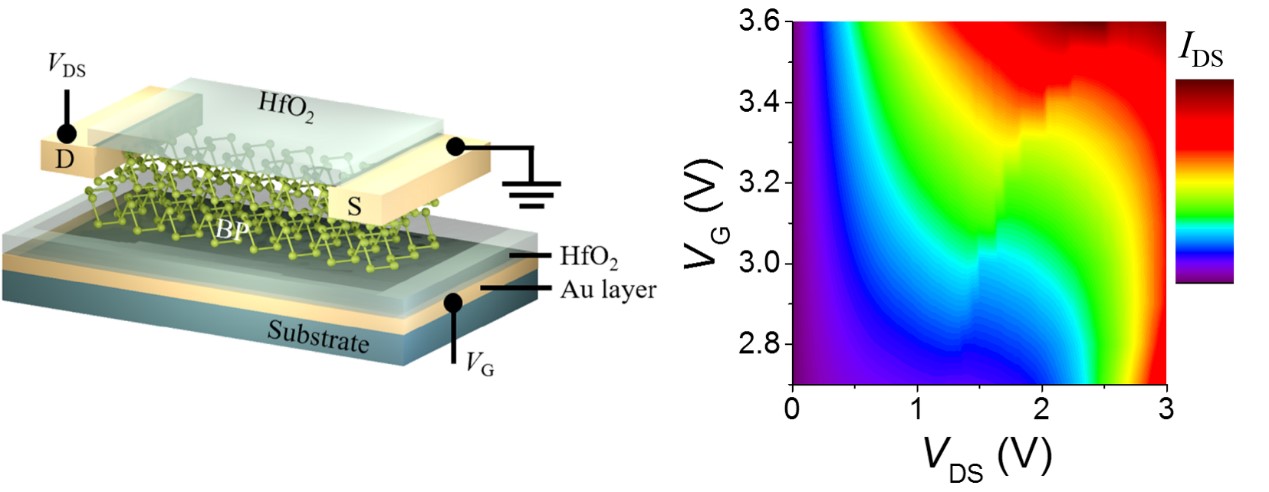 在传统半导体领域中,材料不同的导电类型通常来源于不同的杂质掺杂,无法通过电学实现导电行为的转换。而在双极性二维半导体中,电子和空穴可同时在沟道中传输,其导电行为不仅受栅电压的调控,也很大程度上受到源漏电压的影响。这一效应在薄栅介质层器件中尤为明显,可为未来可重构电路芯片的设计提供新的途径。何军教授课题组长期从事双极性二维半导体器件方面的研究,包括双极性二维半导体导电类型的界面调控(Adv. Mater. 2019, 31, 1901144Adv. Mater. 2019, 31, 1805317)和双极性二维半导体异质结导电行为的动态调控(Adv. Funct. Mater. 2019, 29, 1804897Nat. Electron. 2018, 1, 356-361)等。近期,国际权威期刊Advanced Materials(《先进材料》)在线发表了何军教授课题组在双极性二维半导体器件方向取得的新进展,论文题目为:“Modulation of Negative Differential Resistance in Black Phosphorus Transistors”(《黑磷晶体管中的负微分电阻调制》)。成人直播 为该研究工作唯一通讯单位,何军教授为通讯作者,程瑞清副研究员为第一作者。