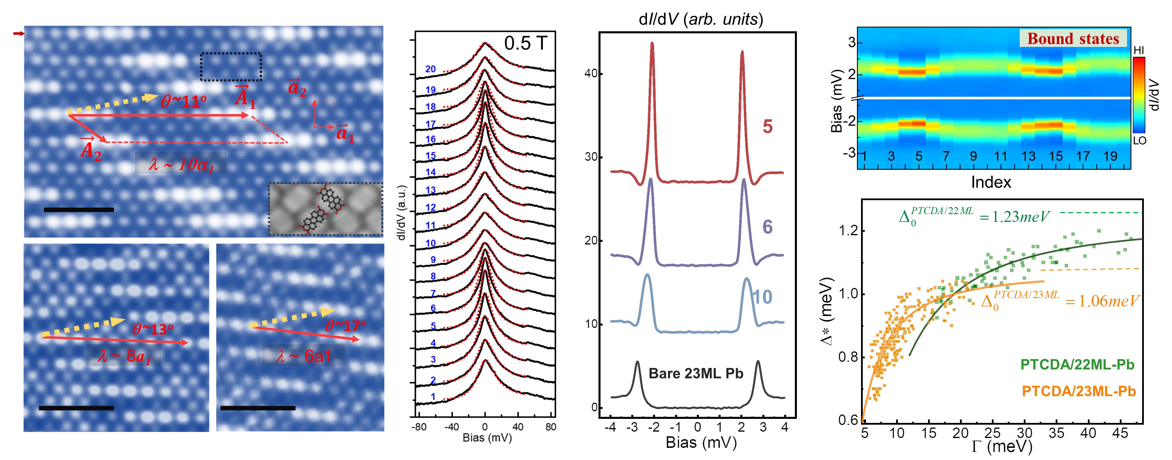 图:铅薄膜上PTCDA单分子层形成不同转角的莫尔超晶格;近藤共振峰和超导能隙内的束缚态展现出莫尔调制特征;PTCDA单分子层与厚度22/23 ML 铅超导薄膜杂化后对有效超导序参量的显著调控。