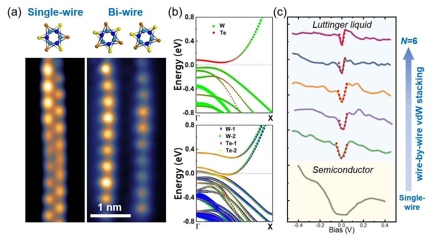 张晨栋课题组通过分子束外延生长的方法,在双层石墨烯/碳化硅衬底上实现了W6Te6范德华纳米线(单根直径~0.8 nm)的可控制备。同时,通过原位的低温扫描隧道显微镜测量,在原子级精度上确定了单根纳米线的本征原子结构与两根/多根纳米线的堆叠结构[图一(a)]。结合第一性原理计算与扫描隧道谱研究[图一(b)],张晨栋课题组首次在过渡金属硫族纳米线体系中揭示了单根纳米线的半导体特性,其带隙大小约为60 meV。两根纳米线间范德华作用,会关闭这一带隙,体系发生半导体-金属转变。进一步地研究发现,金属态的多根纳米线阵列具有显著的Luttinger液体行为,并且其中的电子关联强度可以被纳米线根数所调控。随着纳米线的根数从两根增加至六根,其中的Luttinger因子从g = 0.086逐渐增长至g = 0.136(g = 1 表示该体系为费米液体),这表明纳米线中的电子关联效应随着根数的增加而被抑制。随堆叠根数变化的能带结构与电子关联强度证明了范德华相互作用在一维体系中的重要地位,也为制备与构建电子特性可调的一维材料体系提供了重要思路。