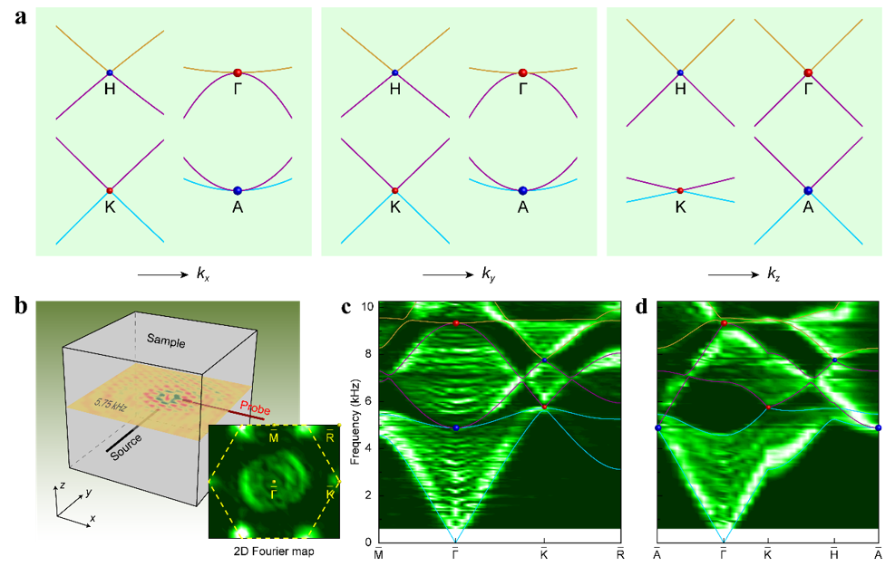 图1:(a)声子晶体中四个不同外尔点的局部放大图,其中Γ点和A点的二重简并点为二次型外尔点,其它为常规外尔点。(b-d)相应的实验证明。