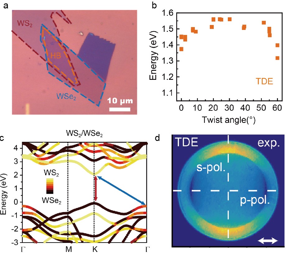 图(aWS2/WSe2异质结的光学照片。(b)异质结中低能新峰峰位随堆叠角度变化的依赖关系。(c)理论计算的异质结能带结构。(d)动量分辨的新峰荧光成像。