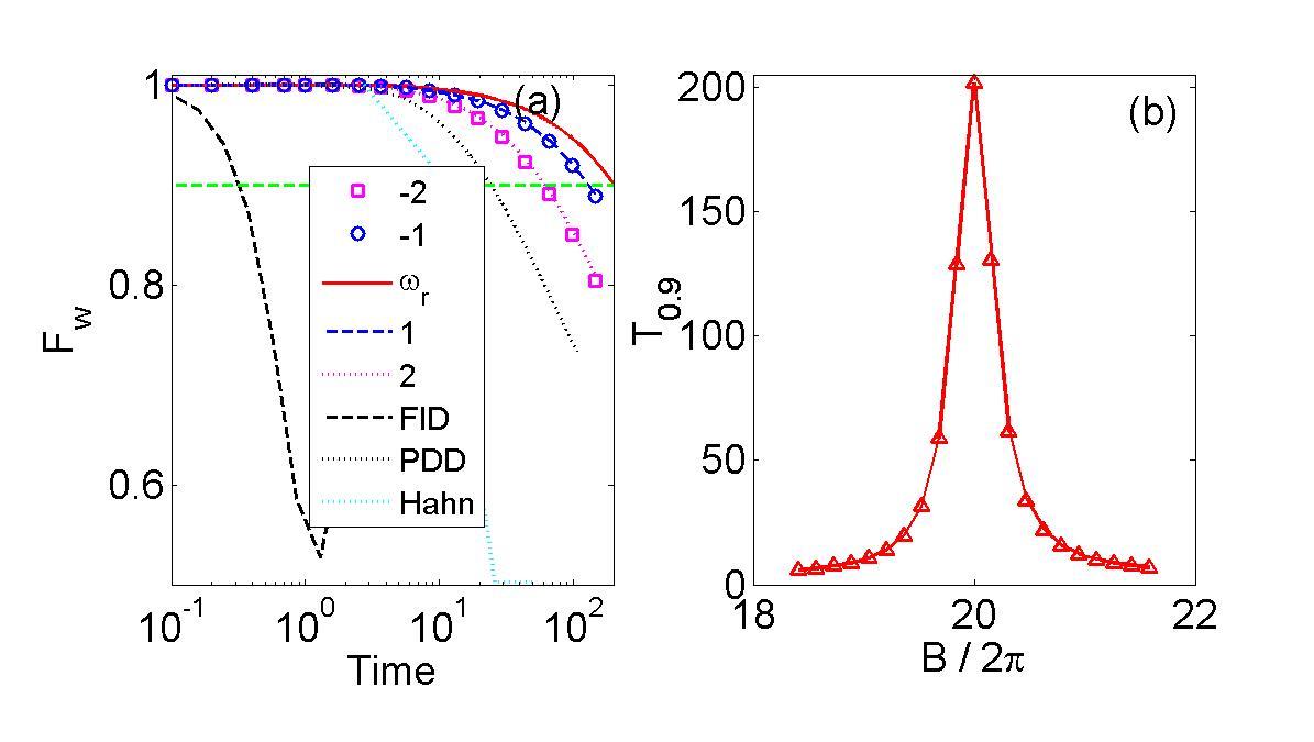 上图展示在半导体量子点中抑制量子环境噪声。结果显示单轴动力学解耦技术比通常的双轴PDD解耦技术和自旋回波技术效果更好。