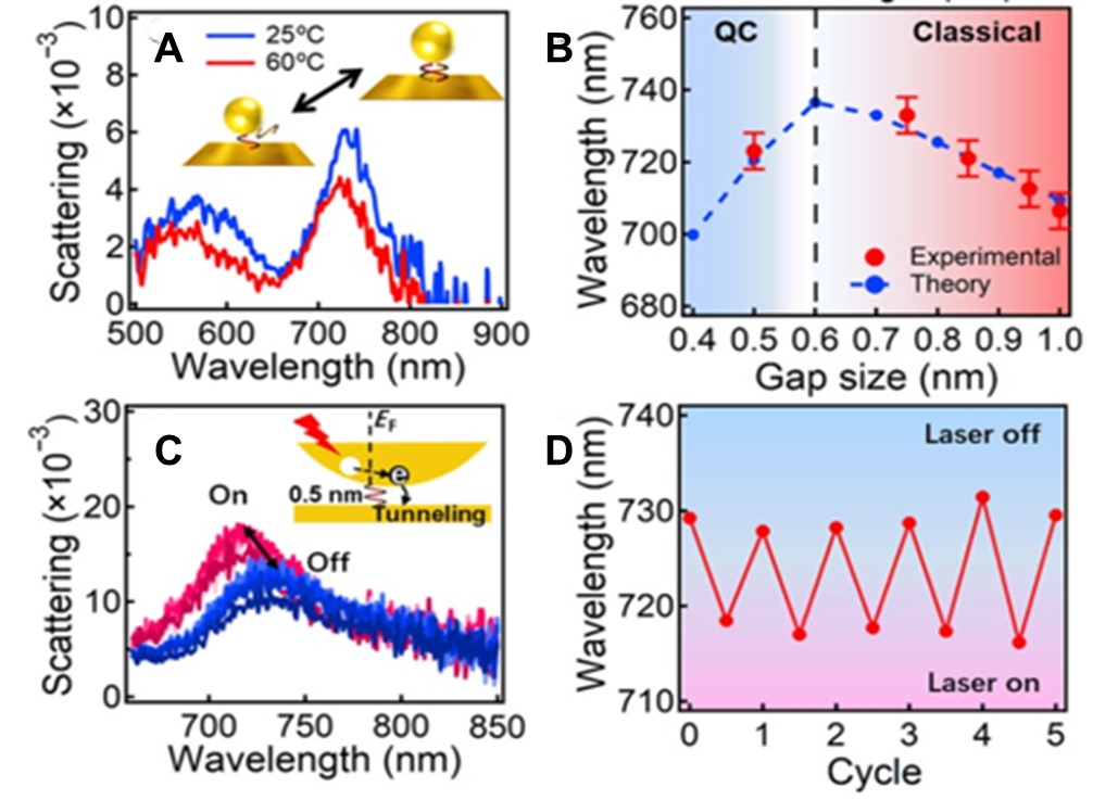 在量子隧穿极限附近,等离激元谐振随着纳米间隙的不断减小呈现出先红移后蓝移的特征,与经典和量子校正模型吻合较好(图2B)。在量子隧穿状态下,研究者们观测到等离激元诱导热电子隧穿可使纳米间隙的电导率增加,导致量子等离激元发生可逆蓝移(图2C,D),这为光学可调谐的量子等离激元提供了器件原型。