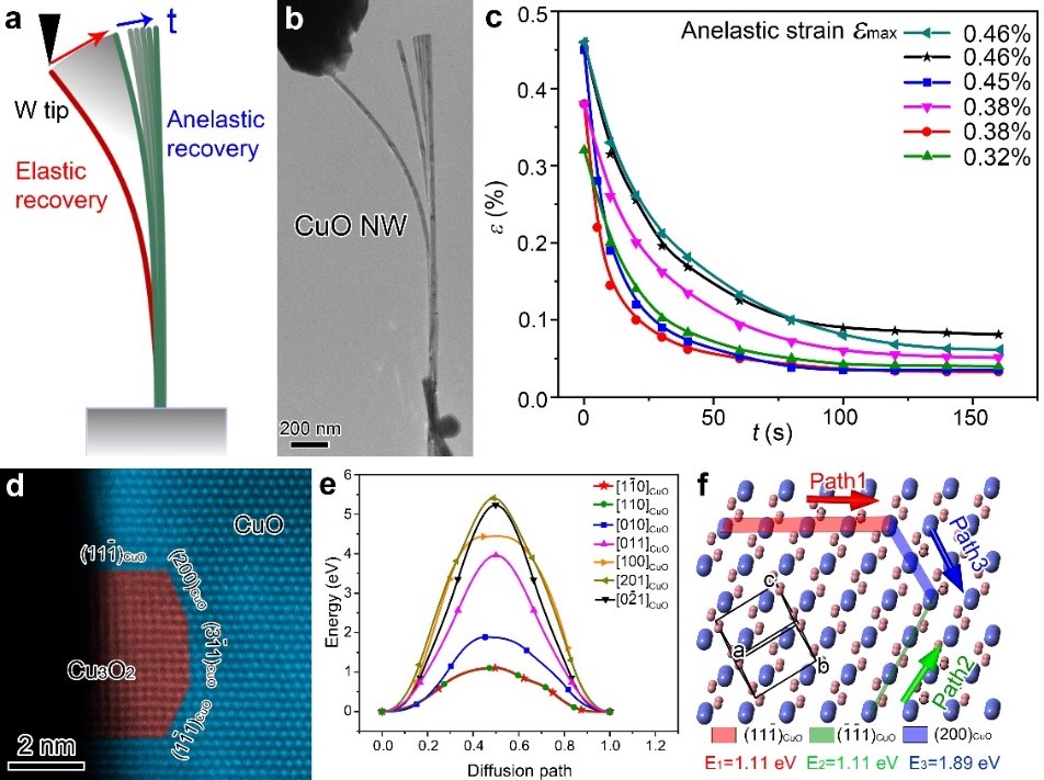 CuO纳米线的滞弹性(a-c)以及常温氧空位迁移机理(d-f)
