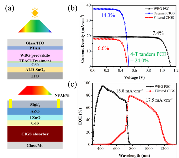 近期,成人直播 方国家教授课题组,与肖旭东教授课题组和嘉兴学院尹新星博士课题组合作,在宽带隙钙钛矿太阳能电池及钙钛矿/铜铟镓硒四端叠层电池研究领域取得新进展。