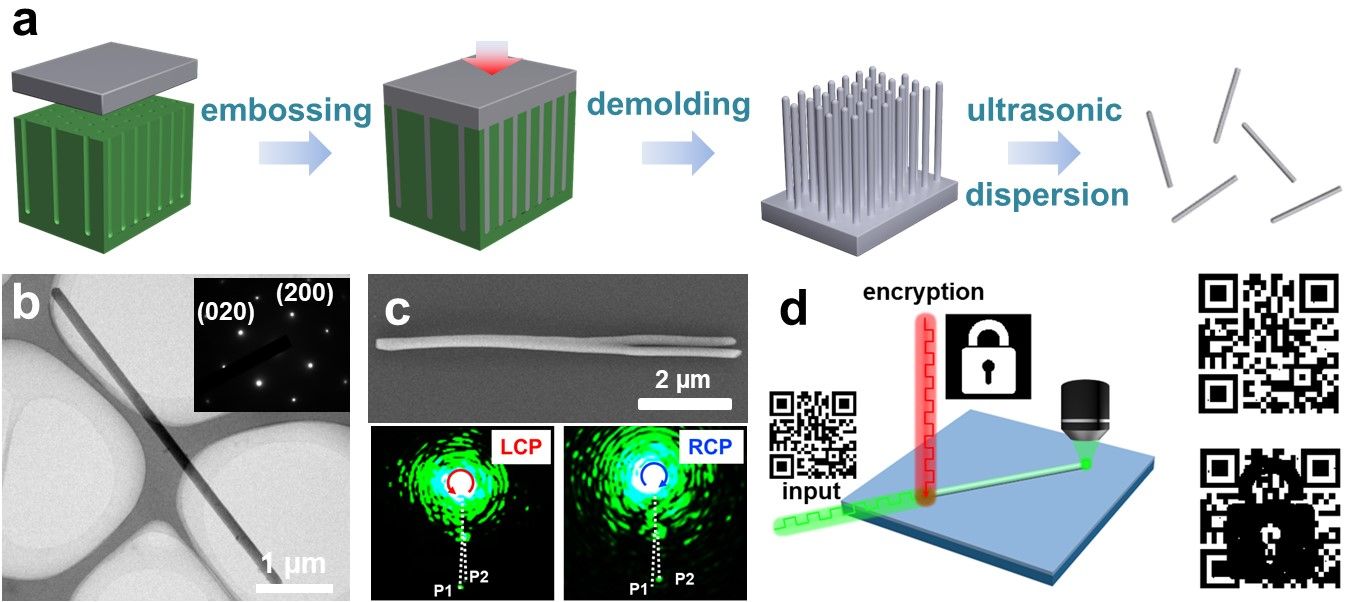 图1. 超模塑压印制备金属铝纳米线及其在光波导方面的应用。(a)加工示意图,(b)TEM及电子衍射图,(c)分叉铝纳米线的偏振光学路由,(d)基于铝纳米线的光学信息加密与传输。
