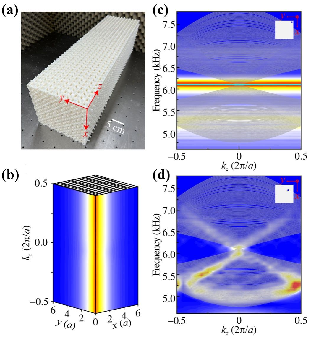 图二:(a)用于测量一维棱态的声子晶体样品;(b)6.10 kHz频率时x-y-kz空间声波场分布;(c)测量和仿真的一维棱态;(d)测量和仿真的一维投影体带结构。