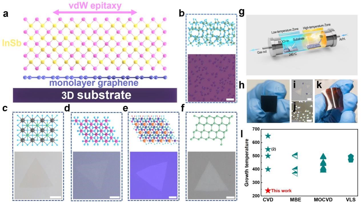 何军教授团队首次提出了一种新颖方法——采用低温范德华(vdW)外延技术,在多种衬底上成功制备了二维InSb单晶,其厚度仅2.4 nm。值得注意的是,在硅基衬底和柔性聚酰亚胺衬底上都实现了二维InSb原位生长。二维InSb生长所需温度(240°C)与微电子行业硅基集成后端工艺(<400°C)相兼容。基于二维InSb构建的场效应晶体管(FET)器件表现出108以上开/关比,并呈现出超低关态电流(小于10-13A)。此外,二维InSb展现p型输运行为,并且室温下场效应空穴迁移率达到203 cm2v-1s-1。这项研究为二维III-V半导体异质集成开辟了新的途径,并推动其在柔性电子领域中的应用发展,为调控二维尺度下的III-V半导体提供了平台,同时也为CMOS电路器件小型化开辟了一条新的路径。