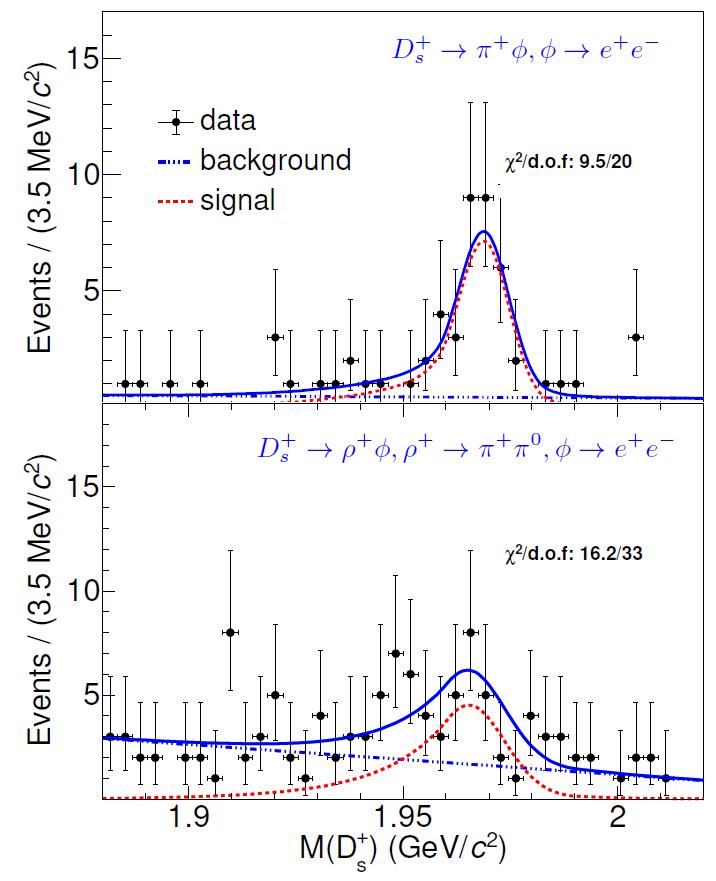 1:通过拟合北京谱仪III实验数据分别提取了38.2+7.8-6.8Ds+ π+ ϕ(e+ e-)信号和37.8+10.3-9.6Ds+ ρ+ ϕ(e+ e-)信号。