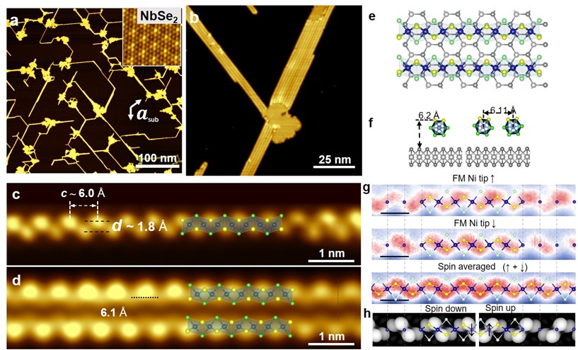 在该工作中,实验人员在范德华磁性材料CrCl3的基础上,运用原位化合物分子束外延生长的技术,在vdW超导体NbSe2的表面上实现了一维CrCl3纳米线、及其堆叠阵列的首次制备。结合自旋分辨的扫描隧道显微学和第一性原理计算,发现一维CrCl3纳米线是由共面的CrCl6八面体组成,表现为一种具有较宽带隙的Neel型反铁磁自旋链。并且该工作还实现了在CrCl3纳米线阵列中的1D-2D可控维度转换,这种维度转化一定程度上可以认为是伴随着磁性基态的相变。该工作对这一新奇的实验发现开展了机理探究,揭示了界面vdW耦合对初期生长条件下的末端/边界的不同生成焓降低作用,是控制维度转换的关键机制。这一发现刷新了领域内对vdW外延机理的理解,并为一维结构的vdW界面调制提供了新思路。