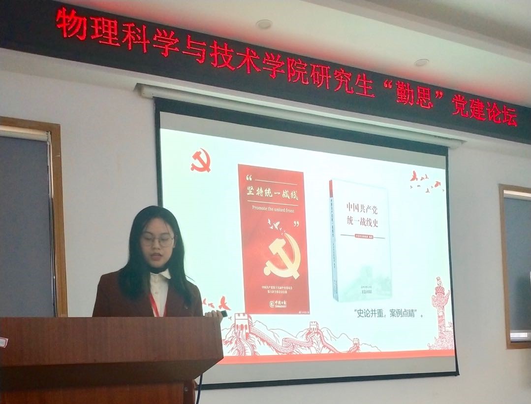 博士生宣讲团张弛讲师首先做了主题为“坚持统一战线,凝聚中华力量”的宣讲。她用几个生动的例子从“什么是统一战线”、“中国共产党如何坚持统一战线”和“我们能做什么”三个方面做了详细讲解。
