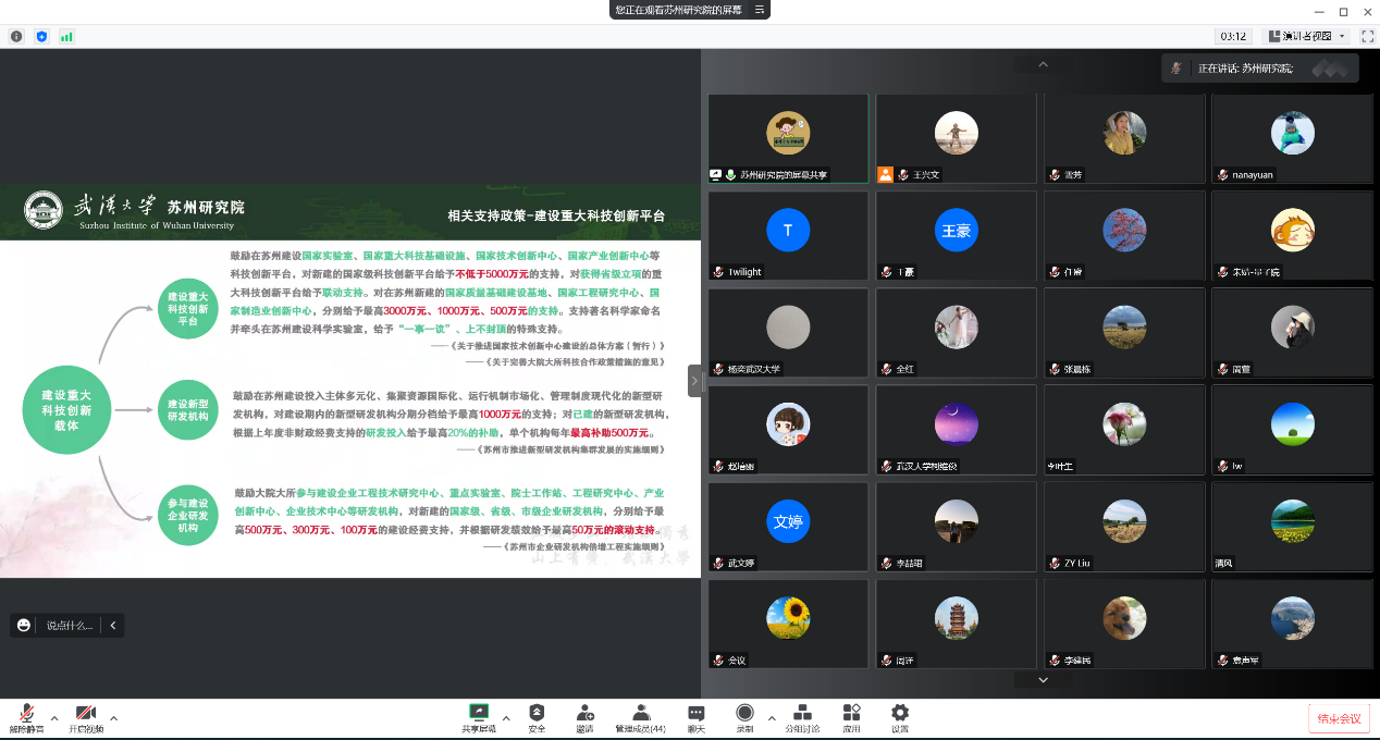 王建彤副总经理就学校关于技术转移与成果转化的总体情况进行了详细解读,具体内容包括学校技术转移中心机构变迁、学校在成果转化方面的实践探索和相关成功案例介绍。孟虹兆主任介绍了学校全链条科创服务校地合作平台——武汉大学长三角科技创新中心,重点介绍了学校浙江、江苏基地。任盛主任对深圳市和广东省科技政策进行了解读,包括深圳市科技计划体系、承接国家重大科技项目管理办法及广东省基金项目资助体系等。王丽副主任重点解读了苏州科技创新环境、高校来苏州科技创新支持政策、苏州研究院科技工作服务体系及光子产业项目征集。