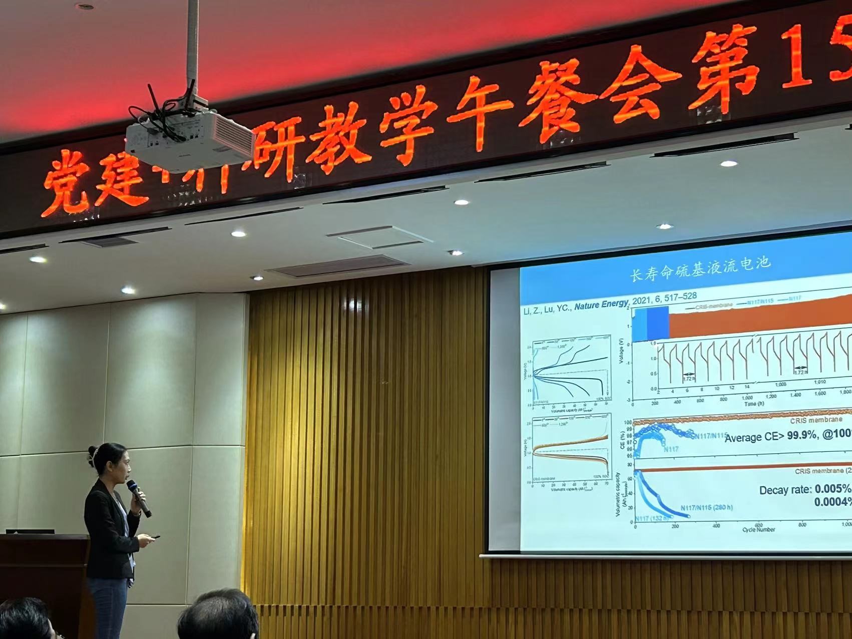 在接下来的午餐会环节中,支部邀请了学院刚引进的国家级青年人才李喆珺教授作了题为“硫基电池的材料设计、机理研究及应用”的专题报告,深入浅出地为大家介绍了硫基电池的相关研究内容,并介绍了接下来研究中的拓展方向和合作意向,引起了在座老师们的浓厚兴趣。