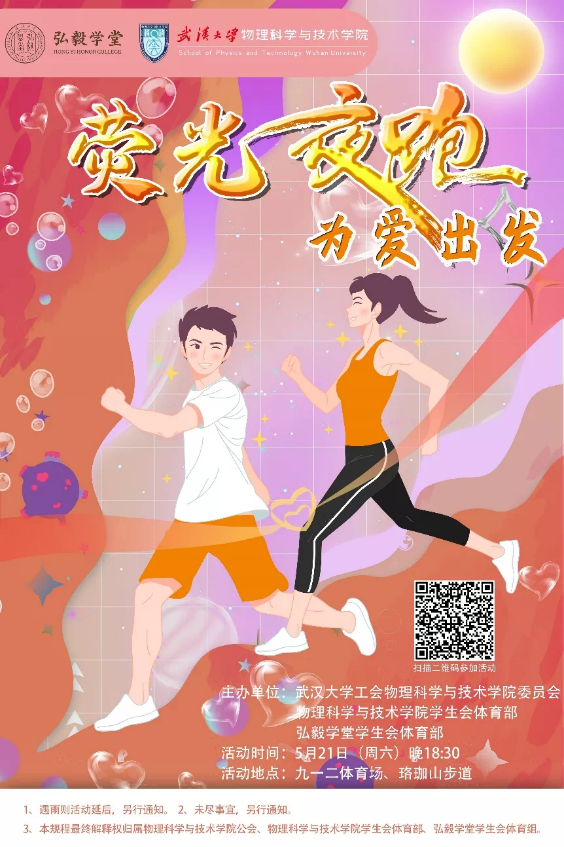 工会、院学生会体育部及弘毅学堂学生会体育部联手举办了“星光荧海,为爱出发——荧光夜跑”活动,吸引了众多学生、教职工及家属参与。物理科学与技术学党委书记余向红、院长何军以及弘毅学堂院长石兢老师也参加了本次活动,并共同为夜跑活动发起跑枪令。