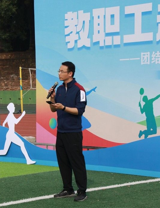 开幕式上,学院党委书记肖湘衡教授代表学院领导致辞。他强调了本次活动的重要性,希望通过这次运动会,进一步加强教职工之间的交流与合作,增强学院凝聚力。随后参赛队员们身着统一的队服,披上代表各自小组特色的运动马甲,精神抖擞的跟着教练、合着音乐的节拍进行赛前热身运动,气氛异常欢乐。