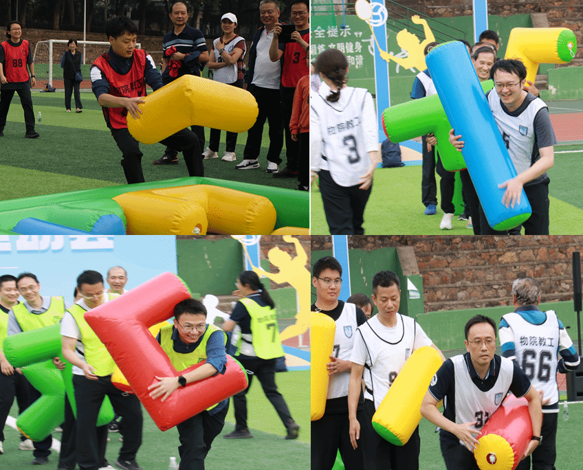 “俄罗斯方块”项目更是考验参赛者的反应能力和策略思维,他们需要各自带着被拆分的不同形状的充气块,通过接力的方式迅速到达终点并拼凑出方块,比赛过程中各队配合默契,商讨好方案后迅速排队,争分夺秒将充气块放置在商定位置,拼凑出完美的方块。