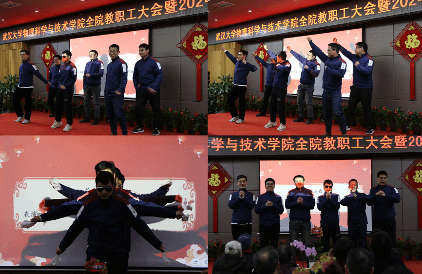 由物理系、材料系、微电系、天文系四位老师表演的三句半《夸夸我们的家》,在锣鼓声中细数学院一年来的成果,诙谐幽默的语言及其包含的鼓舞人心的教学科研硕果引来现场阵阵喝彩。