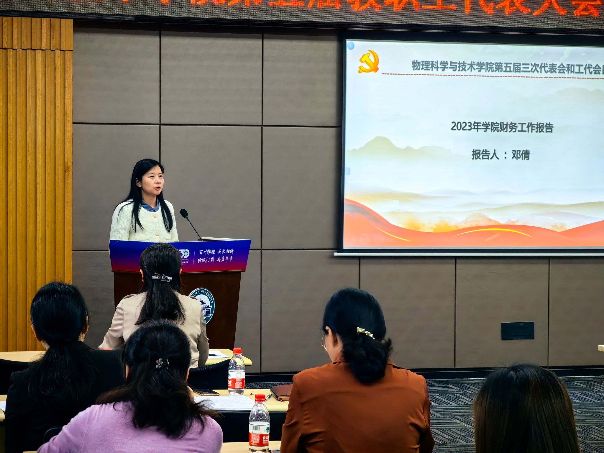 邓倩副院长作了学院财务工作报告,向全体代表详细介绍了学院财务管理制度、2023年财务工作状况以及2024年学院财务预算情况及工作思路,并向代表们介绍了学校经费管理方面的最新政策和精神,希望全体教职工合理规划经费开支,为学院教学科研提供财务支撑。