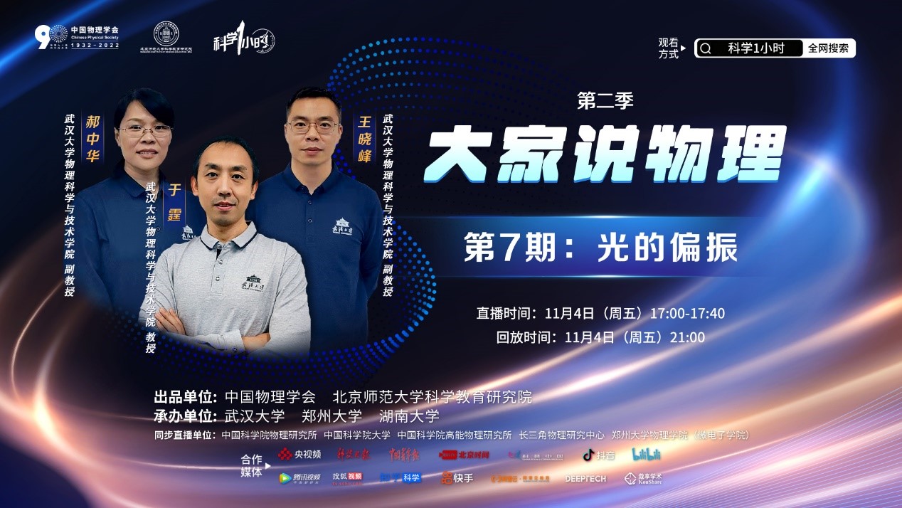 光学课程组于霆教授、郝中华副教授,实验中心王晓峰副教授合作录制的科普视频讲座“大家说物理——光的偏振”在B站、央视频、科普中国、搜狐视频等多个平台播出。