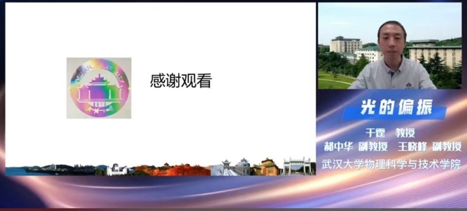 主讲人于霆老师承担物理专业全英文课程《optics》的讲授工作,郝中华老师讲授物理专业《光学》、公共基础课《大学物理》和《大学物理实验》、通识课《自然科学导引》等课程,王晓峰老师讲授《大学物理》和《大学物理实验》、通识课《物理演示实验》等课程。课件PPT的优化方面,还得到了《光学》课程组张顺平教授的建议和帮助。科普视频的录制得到了湖北省物理学会和成人直播