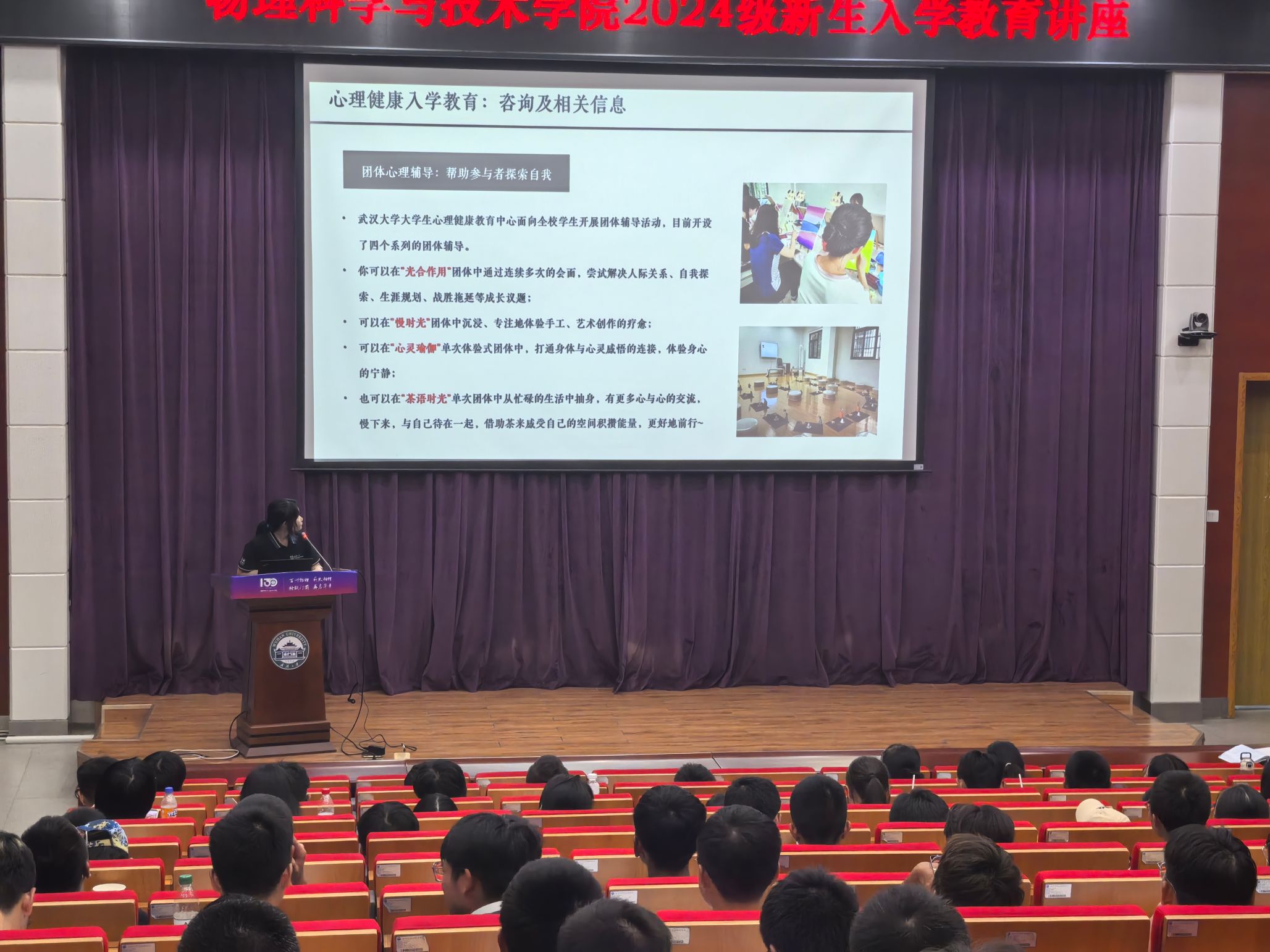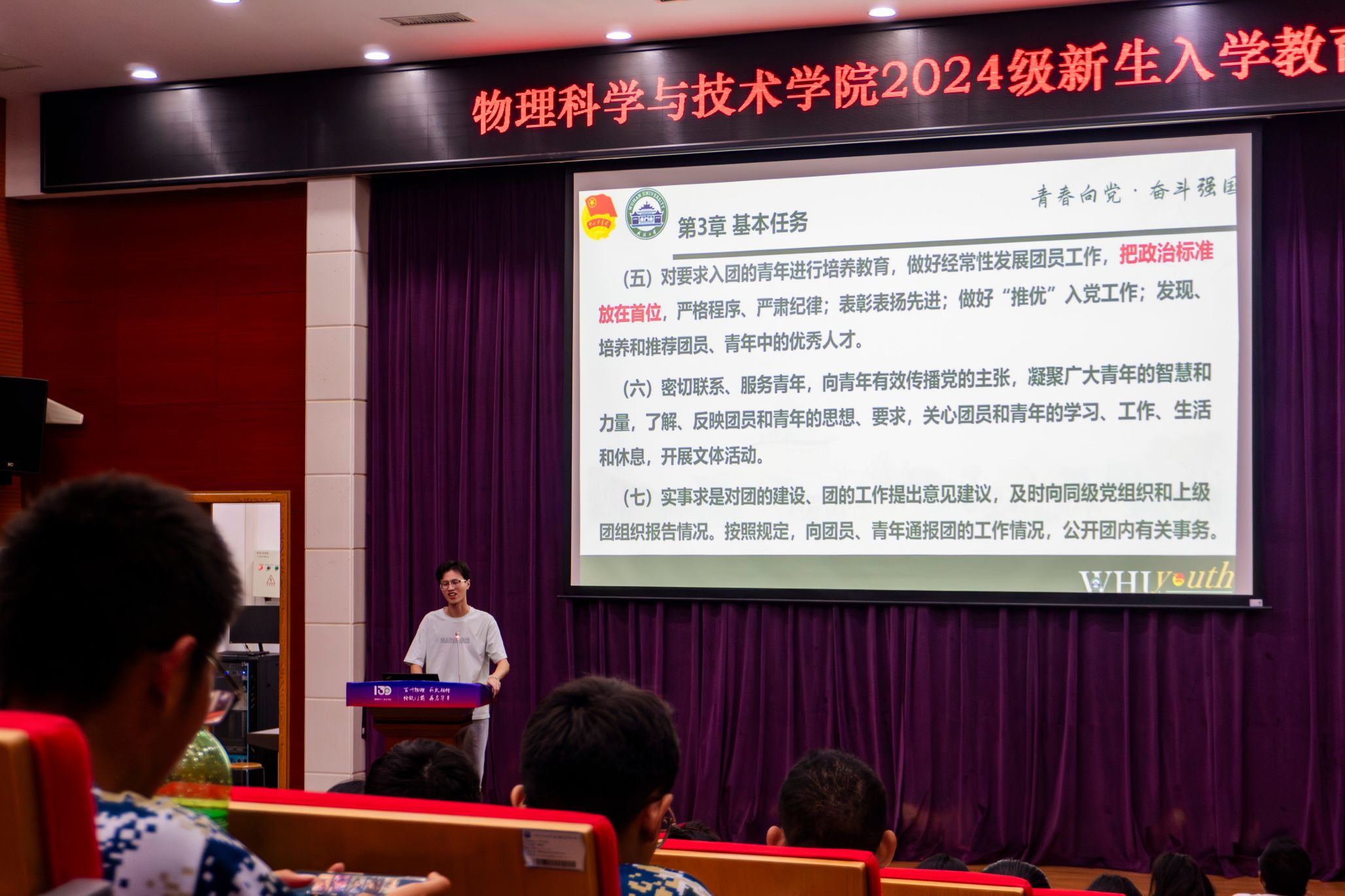 为引导和帮助2024级本科新生更好地适应大学生活,树立正确的价值观和奋斗目标,为未来学习生活顺利进行打下坚实基础,2024年9月13日晚19:00,物理科学与技术学院2024级本科新生入学教育专题讲座在物理科学与技术学院一楼报告厅顺利举行。作为2024级本科生“一年级计划”系列活动,本次入学教育专题讲座结合工作实际统筹谋划,从思想引领、专业培养、心理健康、素质培养等多个方面深入展开,扎实推进2024级本科生“一年级计划”发挥育人成效。