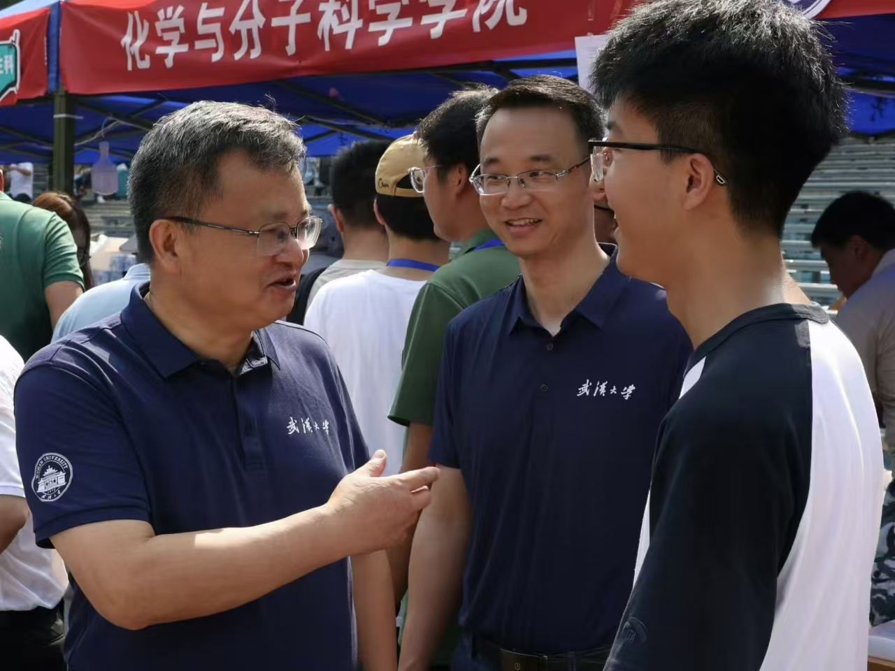 学校高度重视我院迎新工作,党委书记黄泰岩、校长张平文等校领导亲临我院迎新点视察,与我院新生同学及学生志愿者亲切交谈。我院2024级本科生新生田昊、孙策、陈天婴同学作为新生代表,主动向黄泰岩书记、张平文校长介绍了自己对于新时代基础学科发展的信心和进入武汉大学新阶段的目标与方向。黄泰岩书记、张平文校长对同学们的精神风采面貌十分赞赏,对新生们致以诚挚的祝福和问候,并勉励物院新生们发扬求真务实精神,在最美大学探索人生无限可能。
