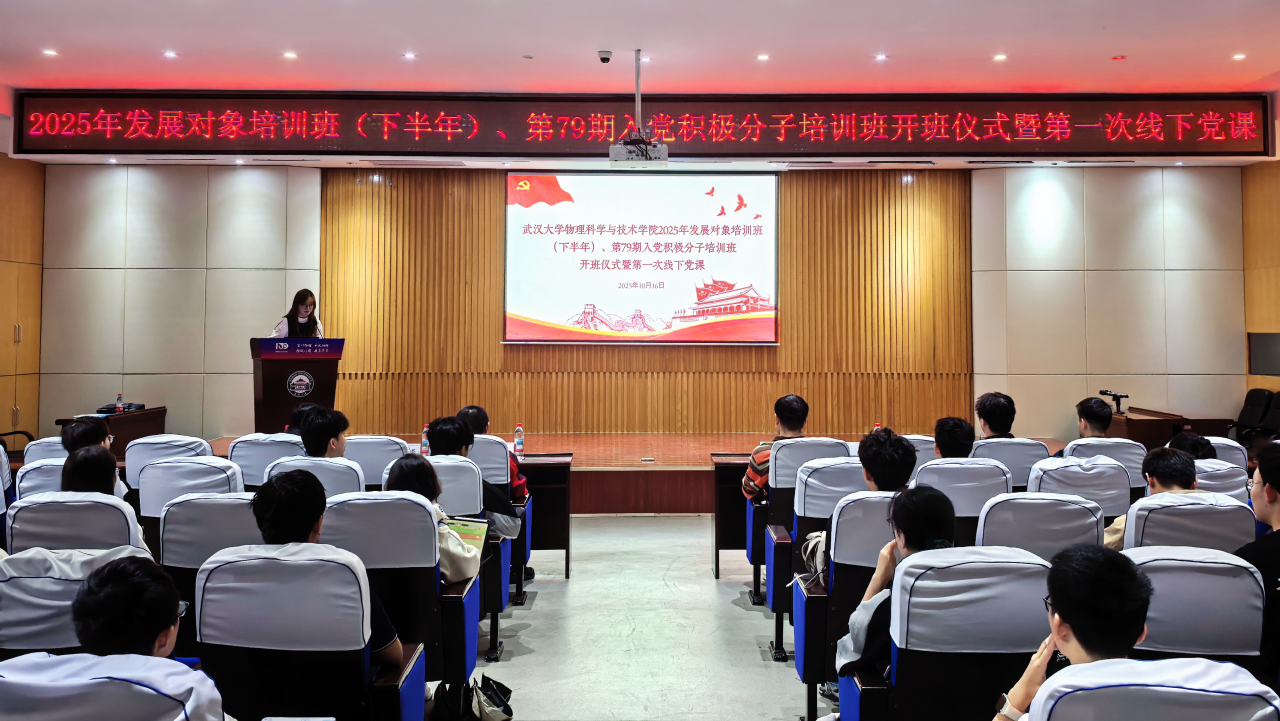 为深入学习贯彻习近平新时代中国特色社会主义思想和党的二十大精神,贯彻落实新时代党的建设总要求和新时代党的组织路线,严格党员发展程序,提升党员综合素质。2025年10月16日下午14:30,武汉大学物理科学与技术学院在学院D503报告厅举办了武汉大学物理科学与技术学院2025年发展对象培训班(下半年)、第79期入党积极分子培训班开班仪式暨第一堂线下党课活动,学院党委副书记陈阳老师、学院青年讲师团杨奕教授、学院党委专职组织员朱娟蓉老师、学生工作办公室副主任刘文娣老师出席仪式。培训班班主任、本科生辅导员彭瑾老师主持本次开班仪式。