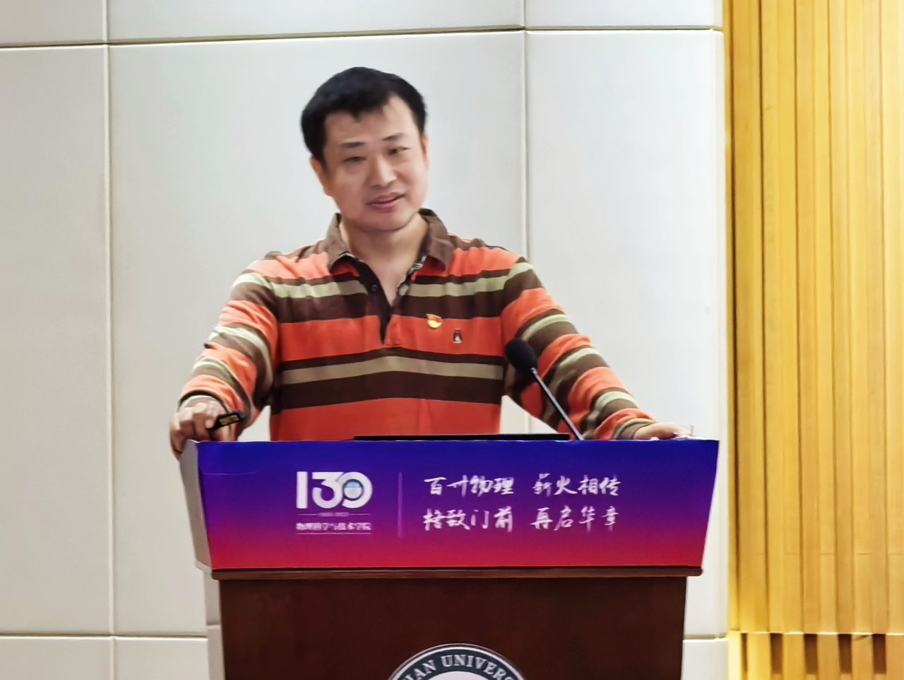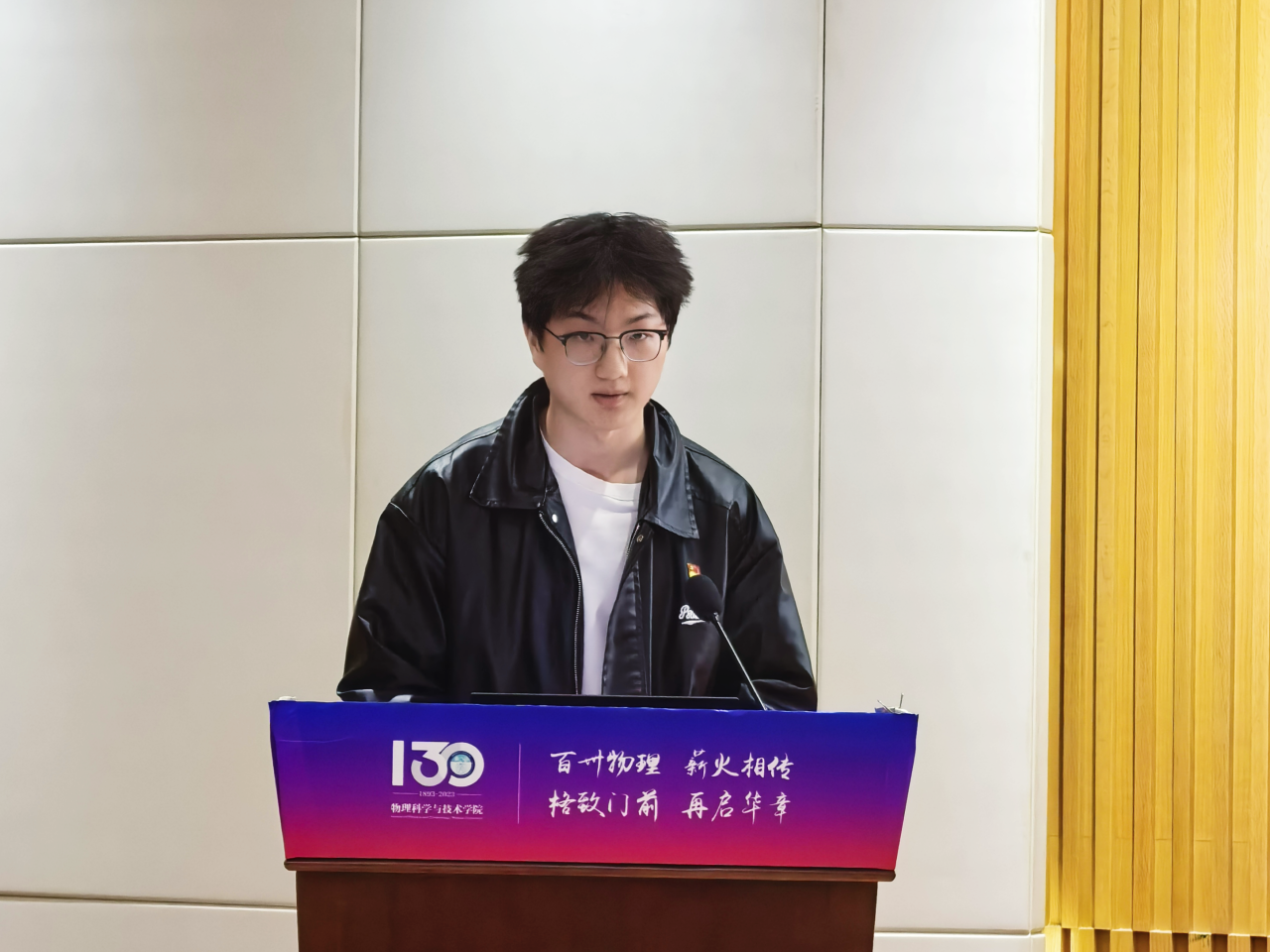 随后,武汉大学党校第75期学生入党积极分子培训班物理科学与技术学院分党校优秀学员代表2023级柴承烨同学发言,他结合自身从入党积极分子发展为预备党员的成长经历,分享了党校学习对其思想塑造的深刻影响。他提到,通过系统学习党章党规、党的百年奋斗史,参与"周顺导读"等实践活动,深刻体会到党员先进性的具体内涵,实现了从理论认知到行动自觉的转化。他从初心坚守、理论筑基、行动赋能三个方面鼓励新学员以党校学习为契机,将个人成长融入国家发展大局,以青春奋斗为物理学科建设和民族复兴贡献智慧与力量。