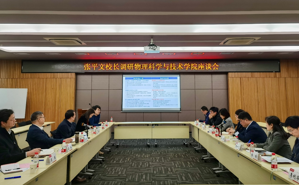 3月29日下午,校长张平文到物理科学与技术学院进行工作调研,校长助理徐东兴、相关职能部门负责人和学院领导班子成员参加调研会。
